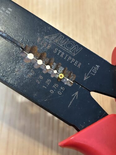 ペンチの数字は配線の種類が書いてあるので0.75sq(スケア)の配線なら0.75の溝に配線をセットしてペンチで挟むと被覆部分に切れ目が入り、そのままペンチを握った状態で配線の根本を引っ張れば被覆が剥けて銅線が露出します。注意点はペンチの方を引っ張ると被覆が剥けた時に勢いが付いて危ないので配線の方を引っ張りましょう。