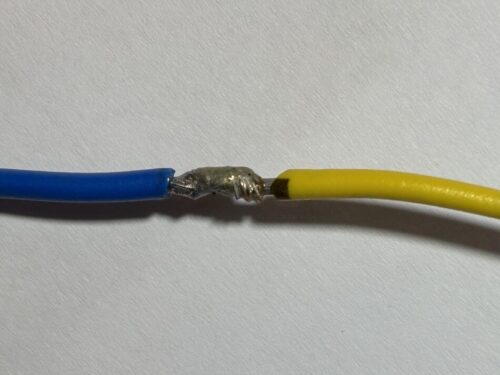 このねじった部分にフラックスを一滴つけ、ハンダごてで熱しながらハンダを当てて溶かし込む。