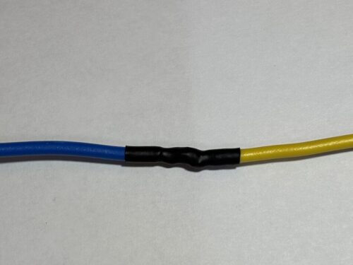 場合によっては後から入れることが出来なくなるので繋げる前に必要な長さに切って入れておきましょう。私は被覆の途切れている部分プラス10ミリぐらいで切って両側の被覆に均等に被せます。被せてドライヤーの熱で収縮させたのがこちら。